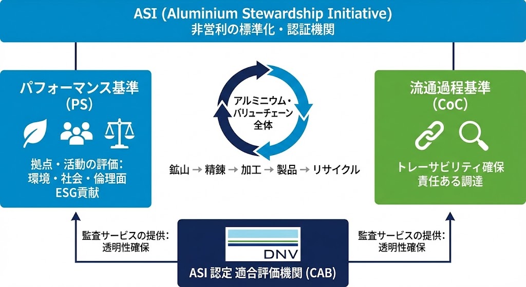 アルミニウム・スチュワードシップ・イニシアチブ(ASI)は、アルミニウムのバリューチェーン全体におけるサステナビリティへの取り組み向上や、ESGへの貢献を目的とする非営利の標準化および認証機関です。同時に国際的な認証スキームでもあり、持続可能性や透明性を高める「パフォーマンス基準(PS)」と、流通過程における持続可能な管理としての「流通過程基準(CoC)」の2つの基準があります。