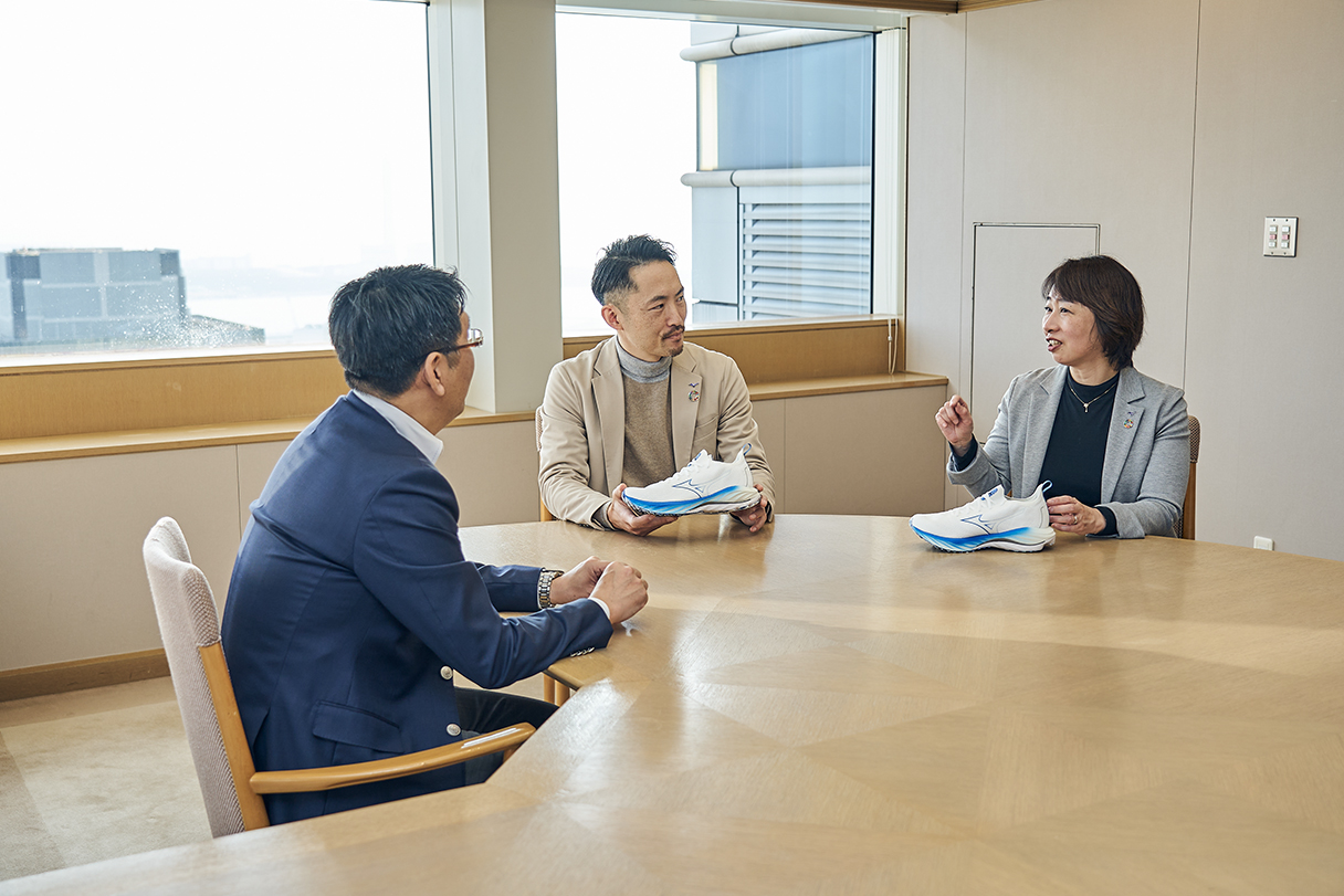 本日はお忙しいところお時間をいただきありがとうございます。今回はミズノ様のカーボンフットプリント取り組みをお聞きする機会をいただきましたので、大阪本社にお邪魔させていただいております。柴田様、土屋様に加えて、猪原様は赴任先のベトナムからオンラインでご参加をいただきありがとうございます。